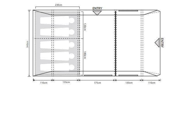 | Features | New Double Width Patio Style Side Door with Phoenix Mesh ventilation Valves: Dynamic Speed Valve for quick inflation and deflation. Rear Bedroom Vortex Ventilation system to reduce condensation. Integral Front Canopy Fully zip-around side door with mesh panel and zip vent. Tinted PVC Windows with zipped curtains. 5 Person Inner with Zipped Divider Includes storm straps for added stability when pitching. NEW darker bedrooms, offer a longer night's sleep by reducing early morning light. Front Zip to add additional canopy Adjustable Pegging system |