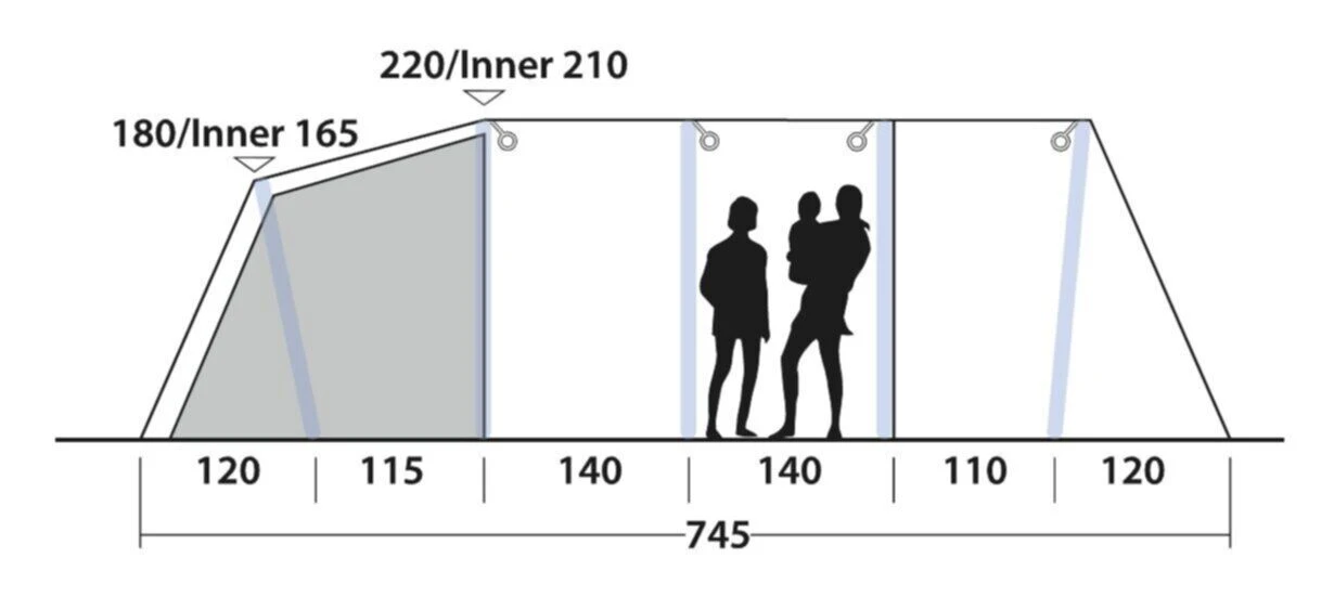 Sleep Comfort: Outwell pride themselves on their ability to design comfortable tents for sleeping, ideal for those with younger children. This one benefits from the Quick & Quiet access into the Premier Dark inners, which is a magnetised door, which allows entry into the sleeping pods silently, without loud zips waking a partner or your children. The inners also have full ancillary zips, if you wish to fully zip them closed for safety purposes. The sleeping compartments have large amounts of ventilation, and zipped inner compartment dividers, making them more private, or allowing the inner to be opened into one larger space.